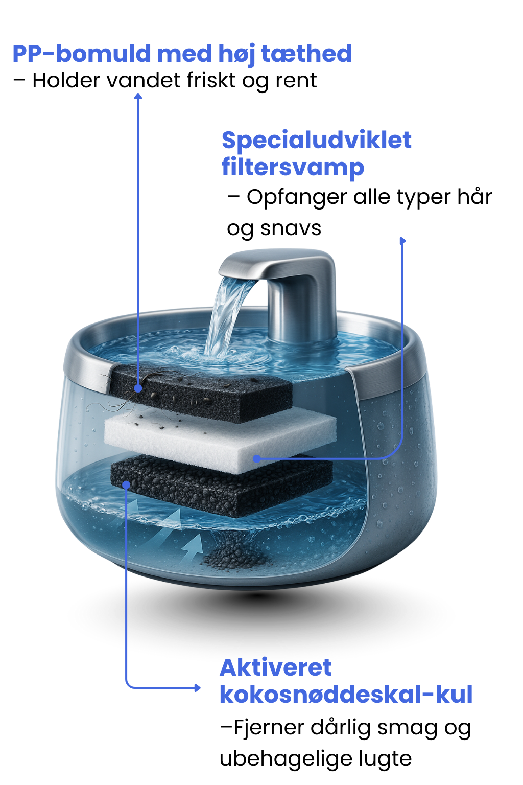 Almindeligt vand fra hanen er helt fint. VetiFlow’s filtreringssystem håndterer urenheder og holder vandet rent, friskt og lugtfrit. Ingen grund til at købe flaskevand.